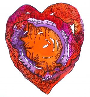 Je werkt o.a. met ecoline, water en gekleurde pennetjes.  Onder je handen ontstaat een veelzeggend symbool waarin het heerlijk doedelen is.
